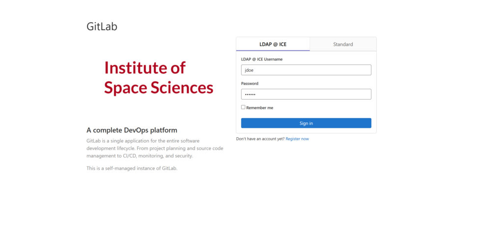 Go to the ICE Gitlab servers https://gitlab.ice.csic.es and log in with your ICE User credentials.